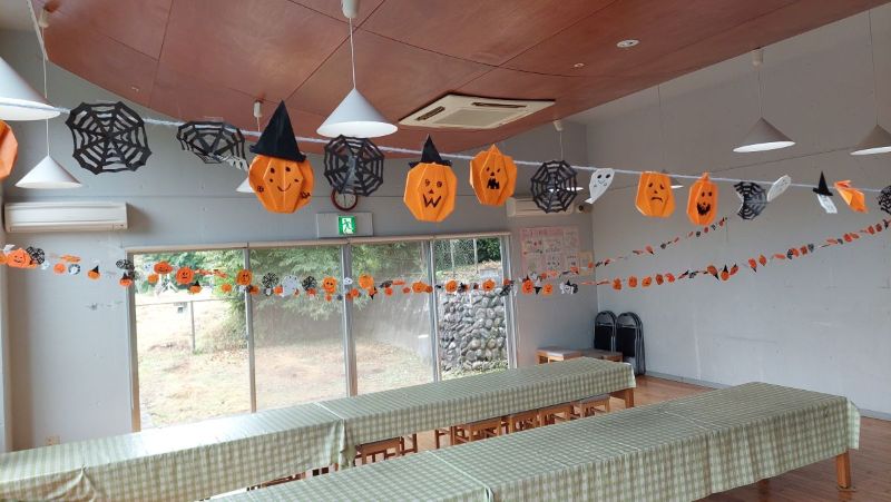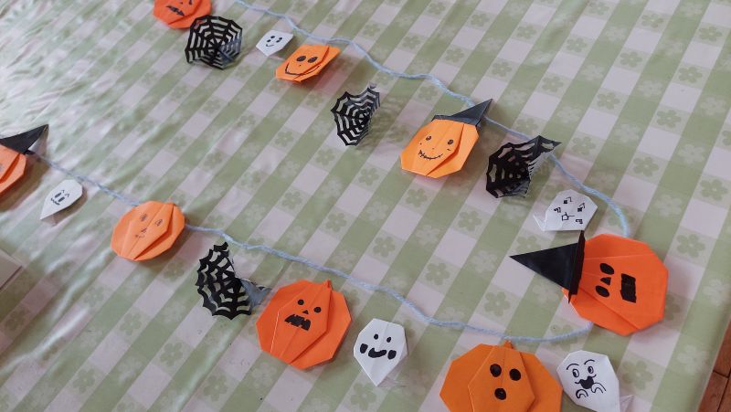 児童とのふれあいでは、折り紙を使っての製作ということで、子どもたちの間に受講者が入り、一緒にカボチャやお化けの飾りを作りました。初めは子どもたちも受講者も緊張気味の様子でしたが、なかには折り紙が得意な子どもがいてくれたので、教わったりしているうちに緊張もほどけ、好きなアニメの話や普段の生活のことなど、楽しくお話していました。